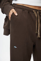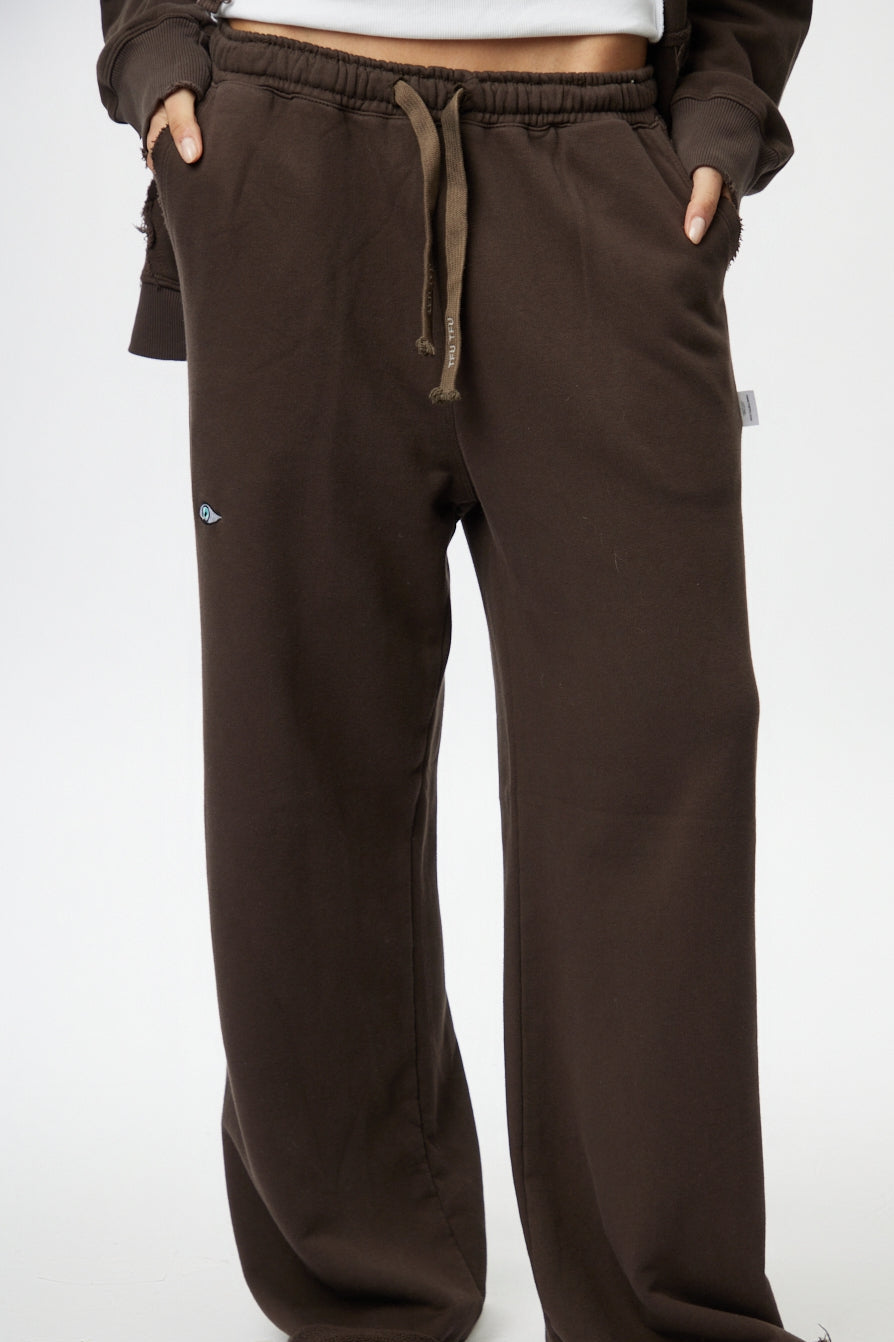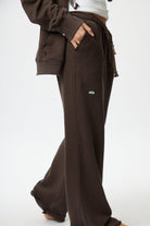 מכנסיים מתרחבים מבד פוטר פרנץ' טרי עשויים 100% כותנה , רקמת עין בחלקו הקדמי של המכנס, גומי במותן, שרוך ממותג מושחל