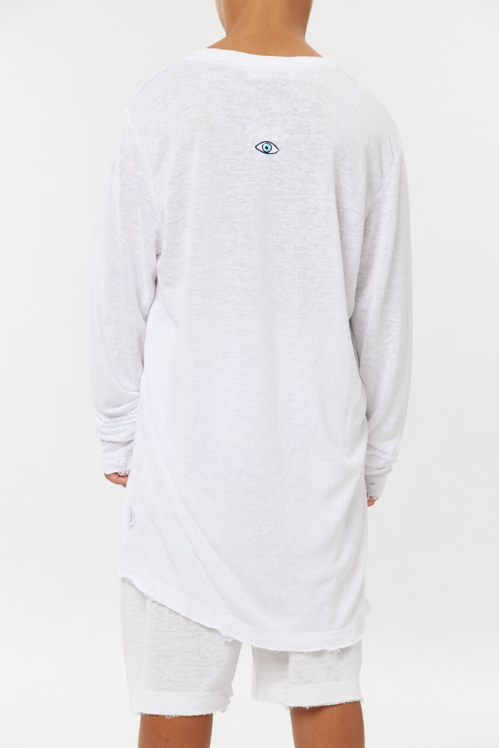 עשויה מבד רך במיוחד, גזרת ניקי במראה קרוע בשילוב הדפס עין בגב בשיטת צבעי מים ופגמנט אורגני.