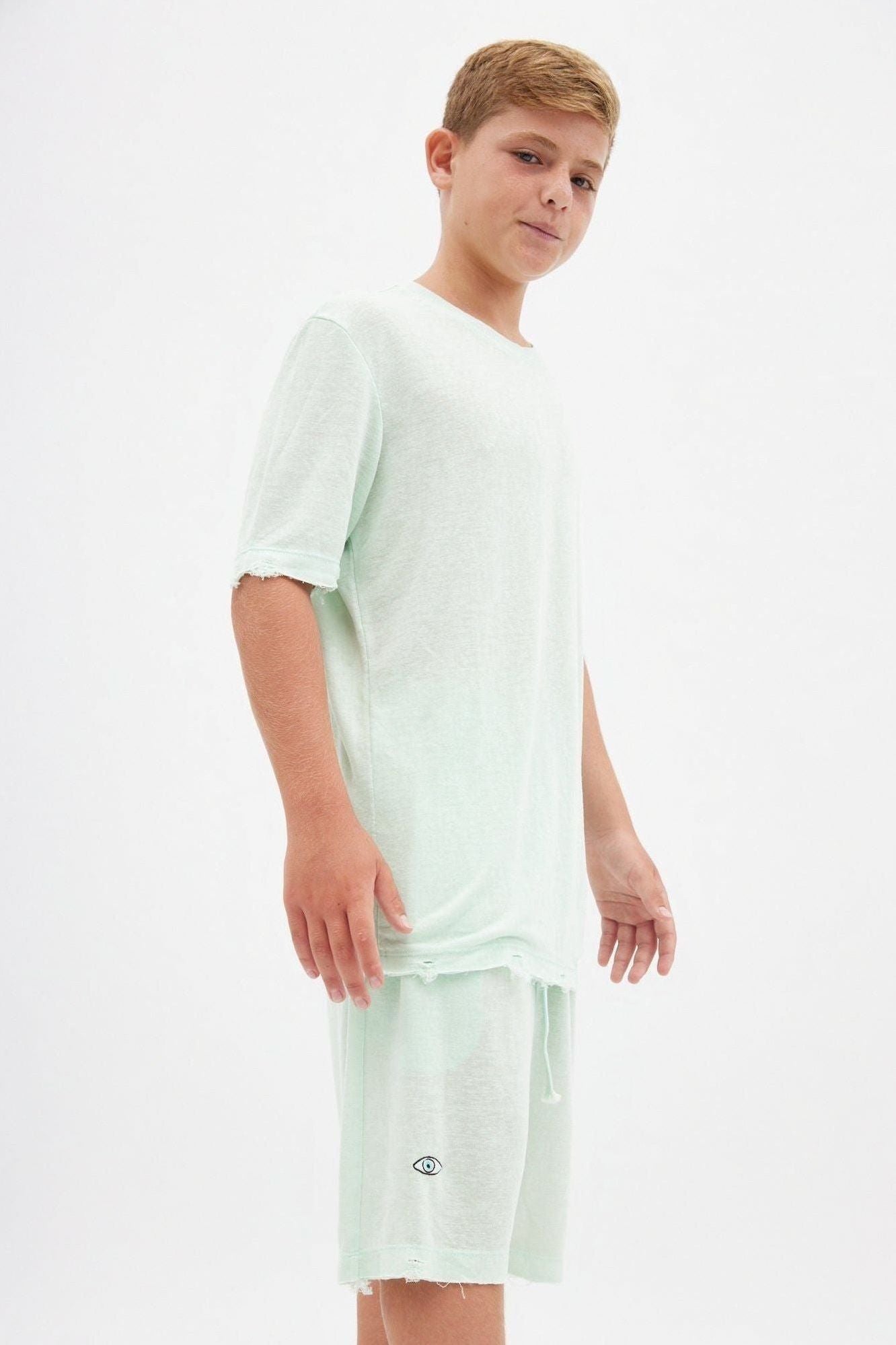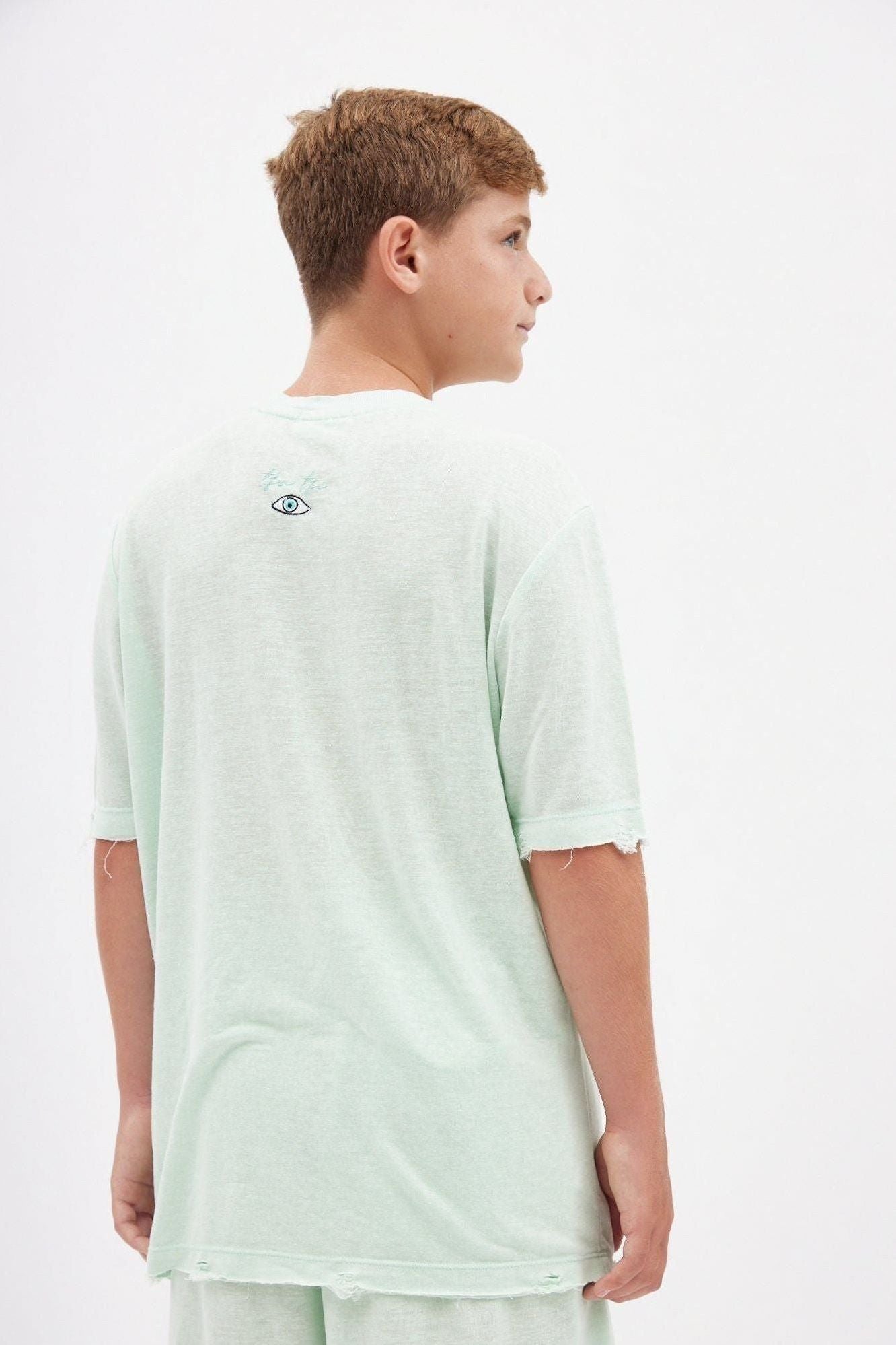 עשויה מבד רך במיוחד, גזרת ניקי במראה קרוע בשילוב הדפס עין בגב בשיטת צבעי מים ופגמנט אורגני.