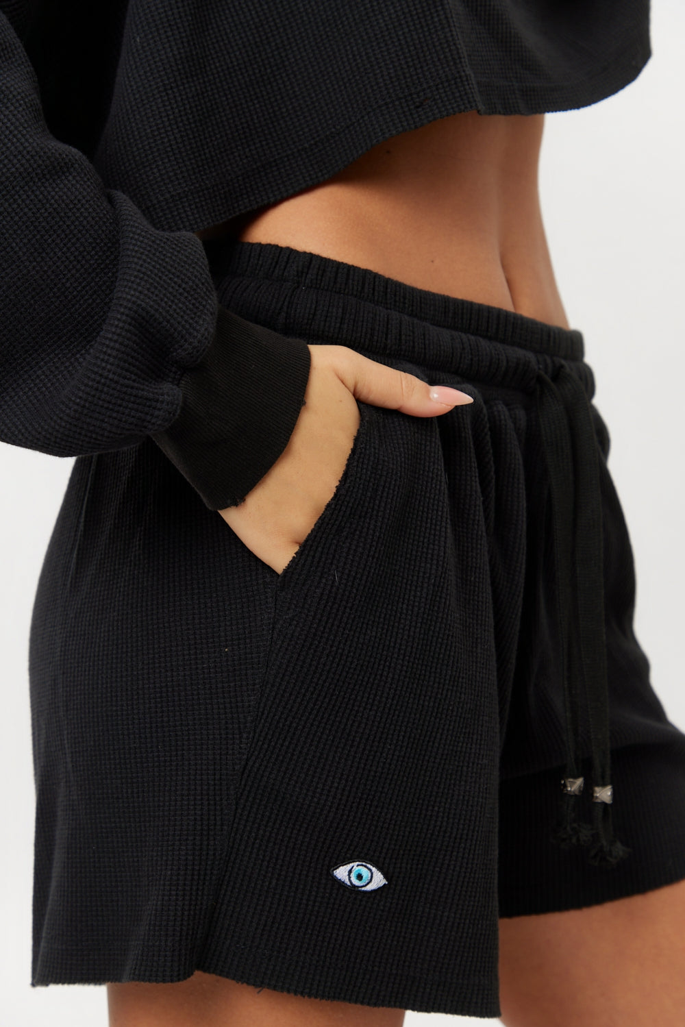 רקמת עין בחלקו הקדמי של המכנס, גומי במותן, שרוך ממותג מושחל