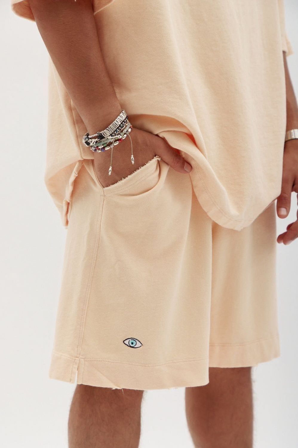 גימור גזור, שרוך ממותג מושחל עם עיטור רקמת עיןבחלקו הקדמי.