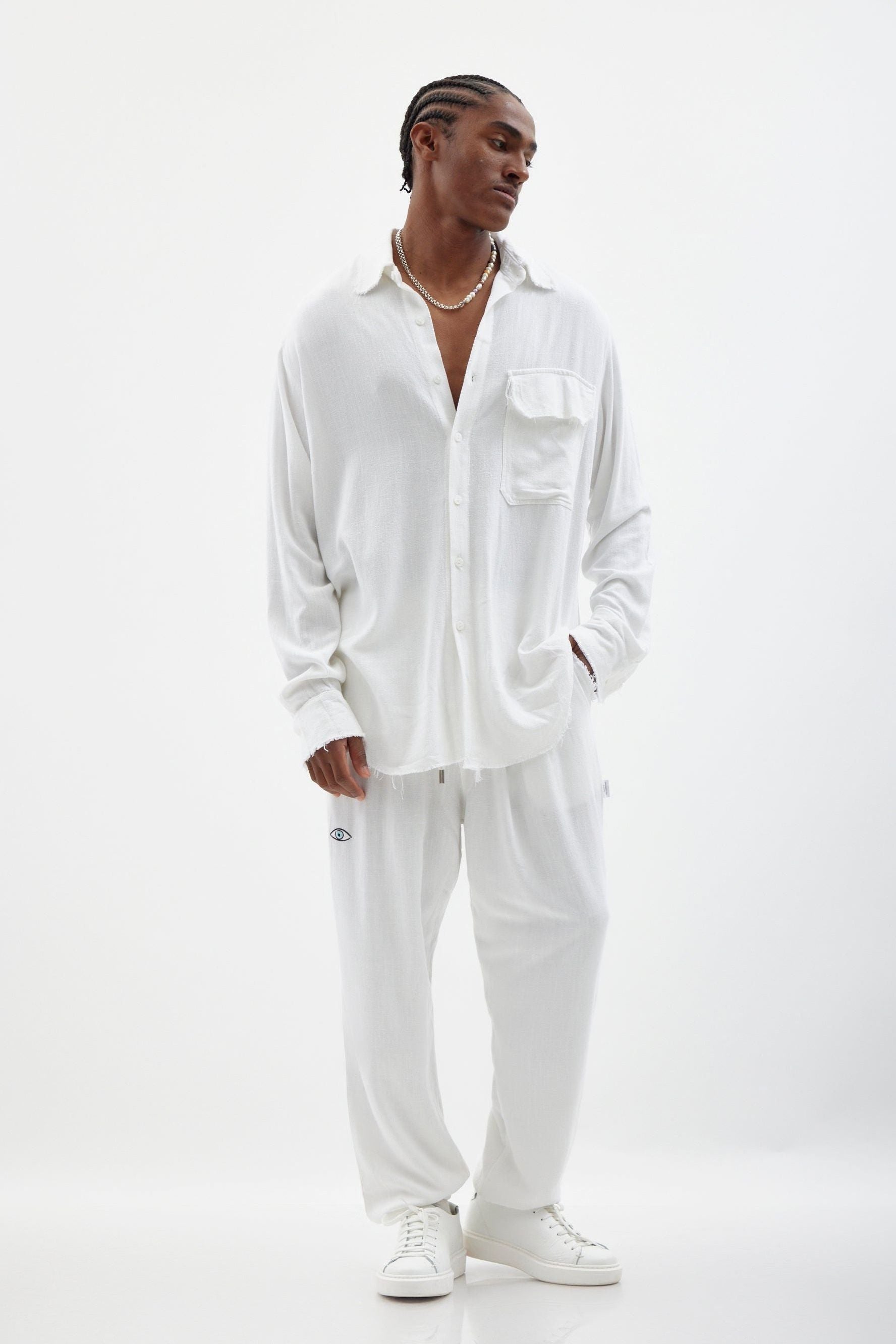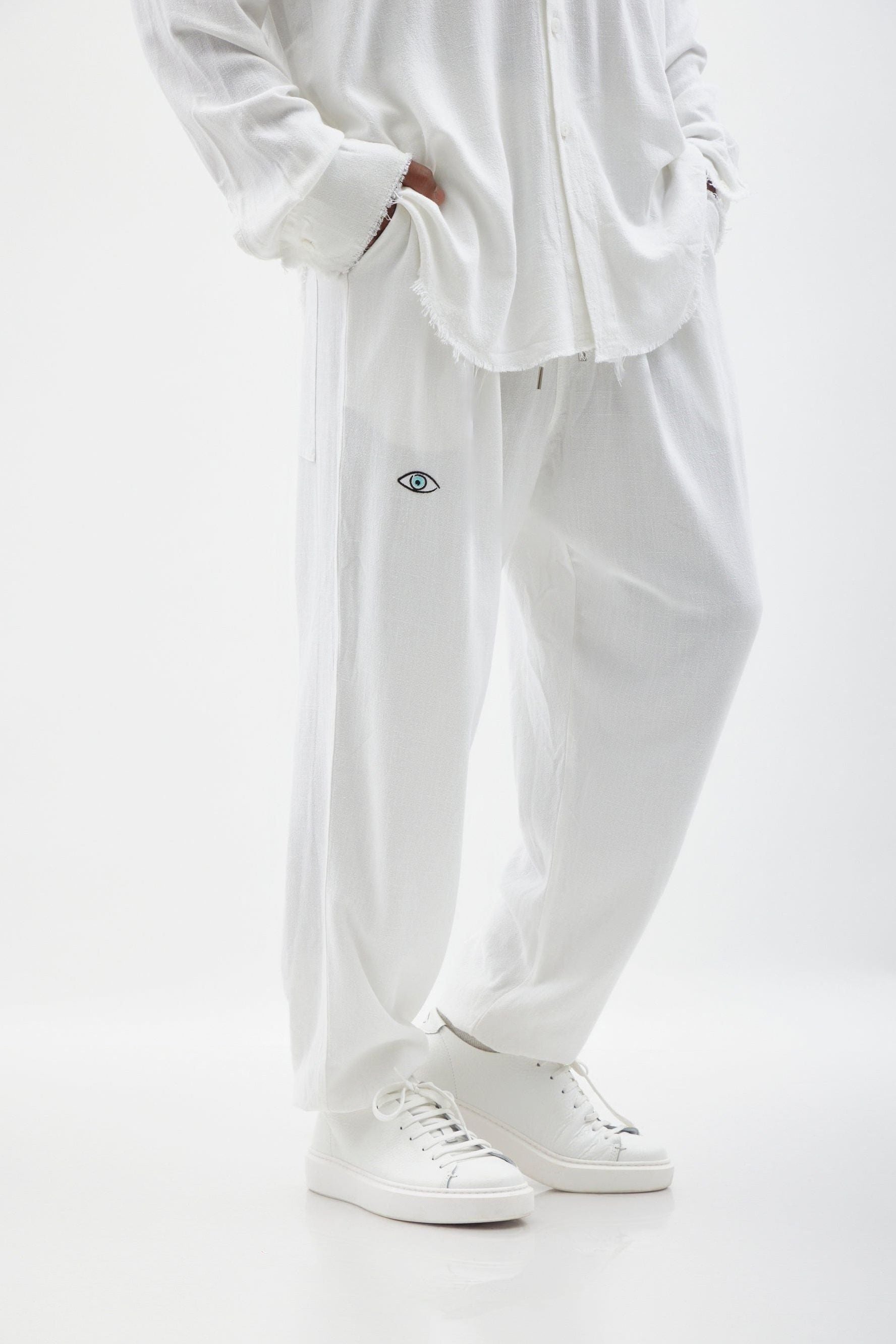 מכנסיים מפשתן רך, רקמת עין בחלקו הקדמי של המכנס, גומי במותן, שרוך ממותג מושחל, כיסים חיצוניים אחוריים וגימור גומי בקרסול