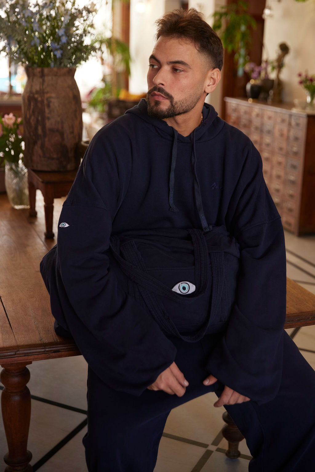 רקמת עין בצדי השרוול , הדפס בחלקו העליון של הכובע
