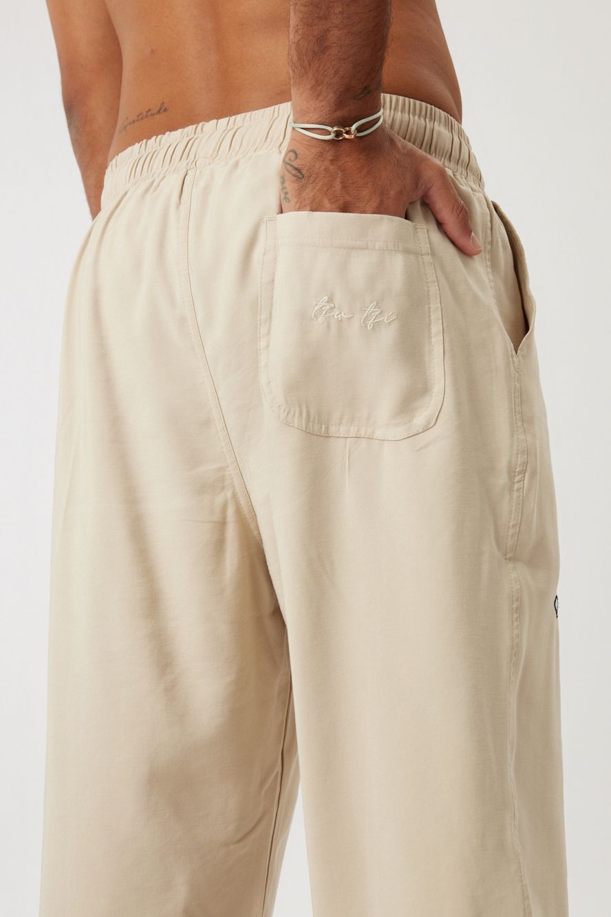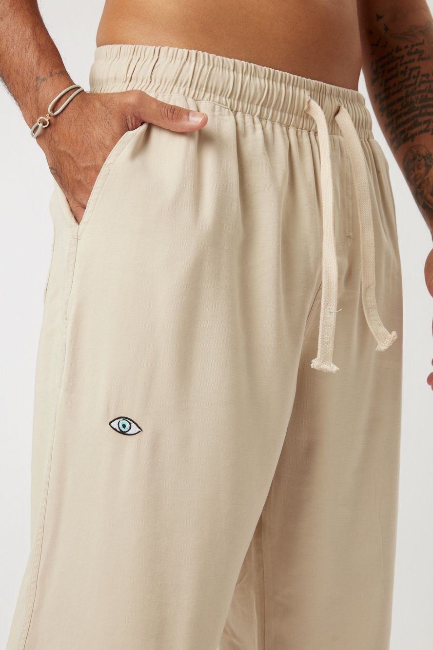 מכנס גזרה ישרה, גומי במותן, שרוך ממותג מושחל, רקמת עין בחלקו הקדמי של המכנס