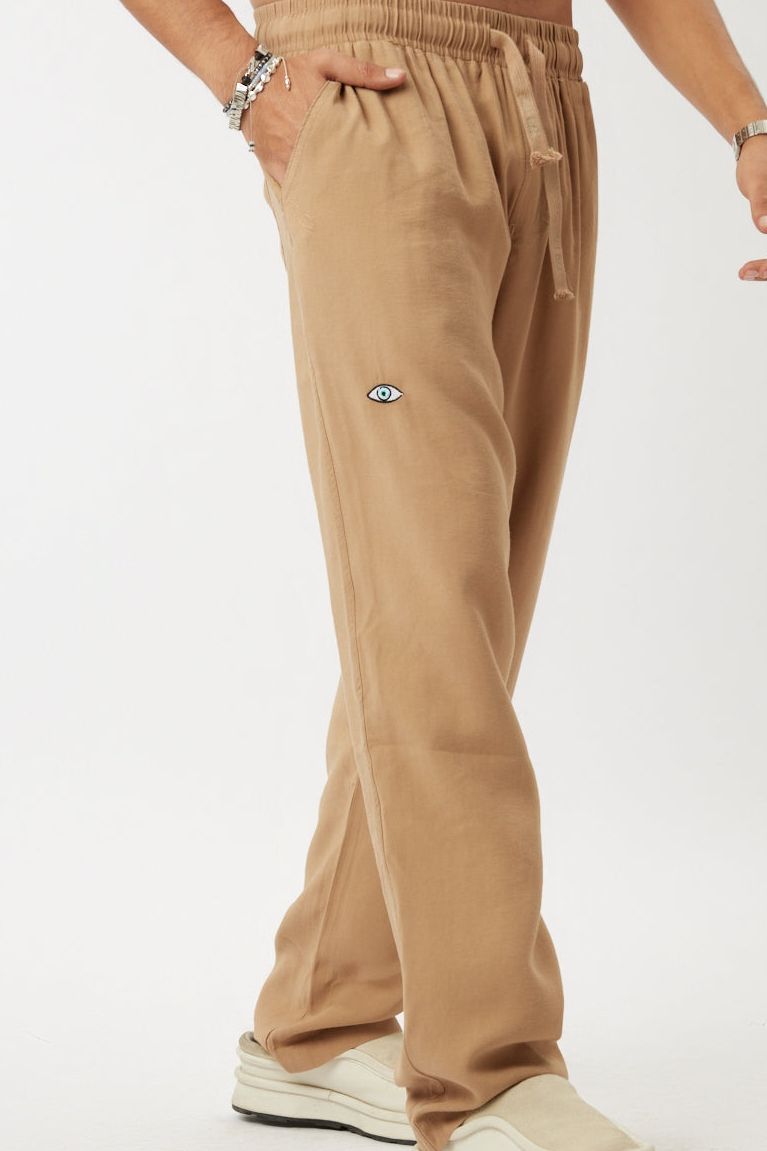 מכנס גזרה ישרה, גומי במותן, שרוך ממותג מושחל, רקמת עין בחלקו הקדמי של המכנס