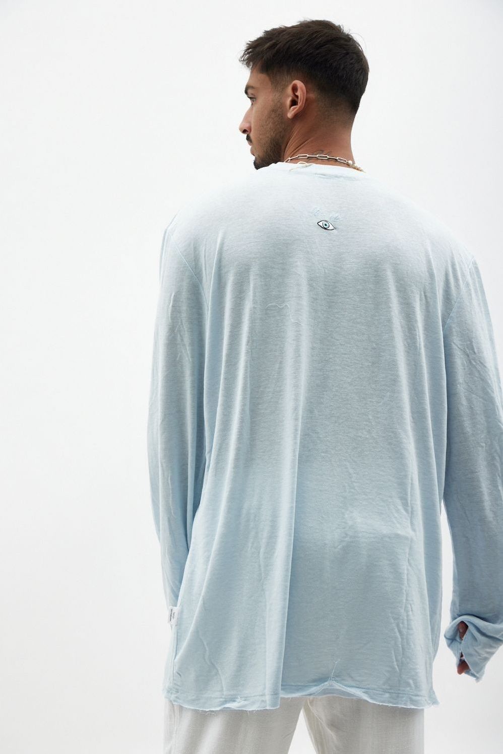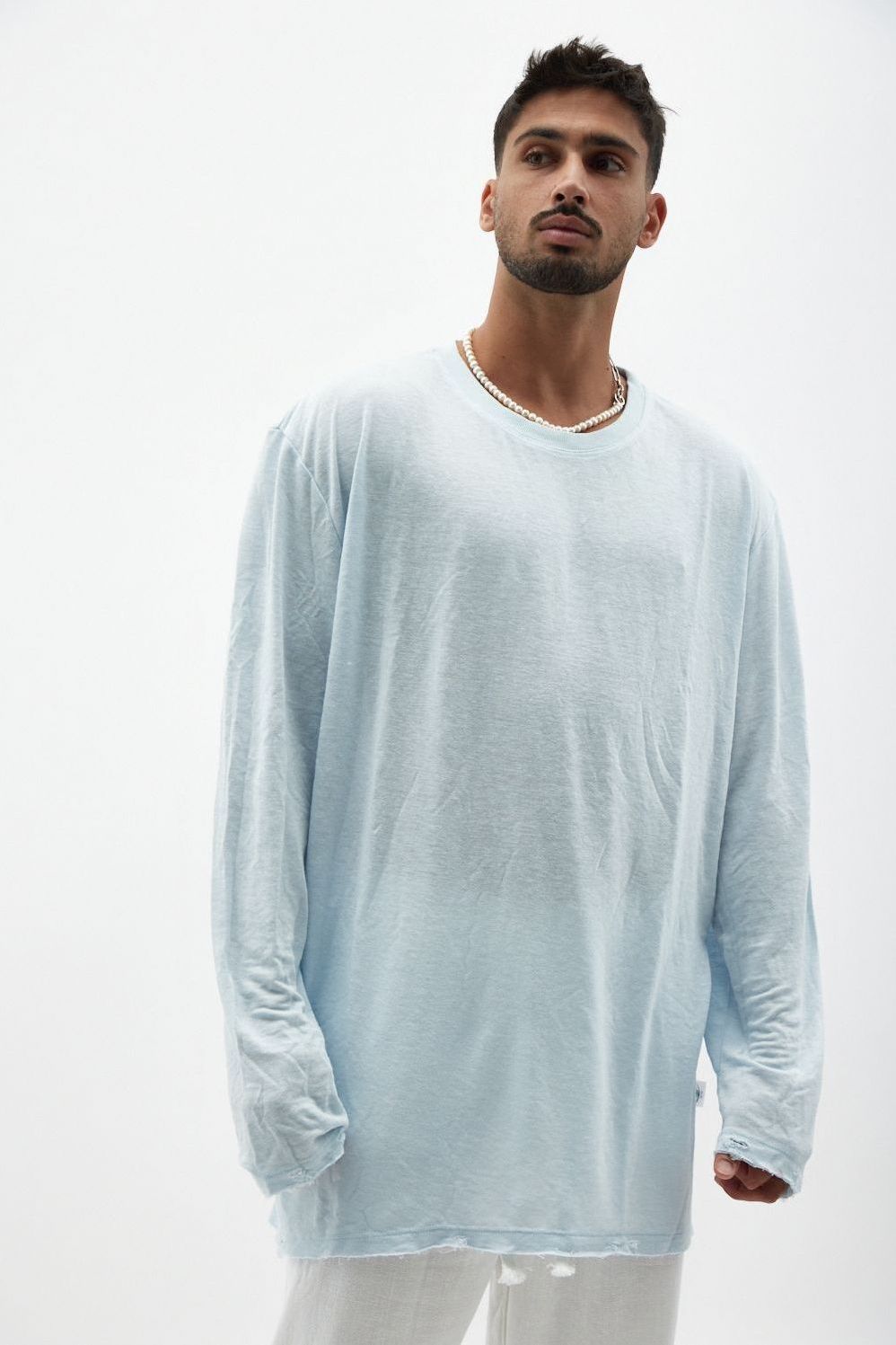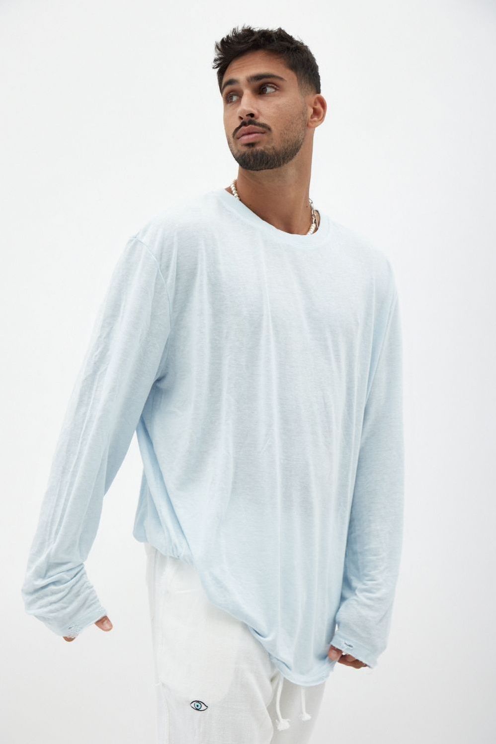 חולצת גברים שרוול ארוך מבד רך במיוחד, עשויה פשתן סרוג, גזרת ניקי במראה לא גמור