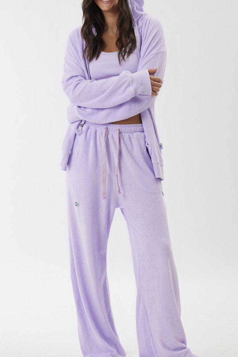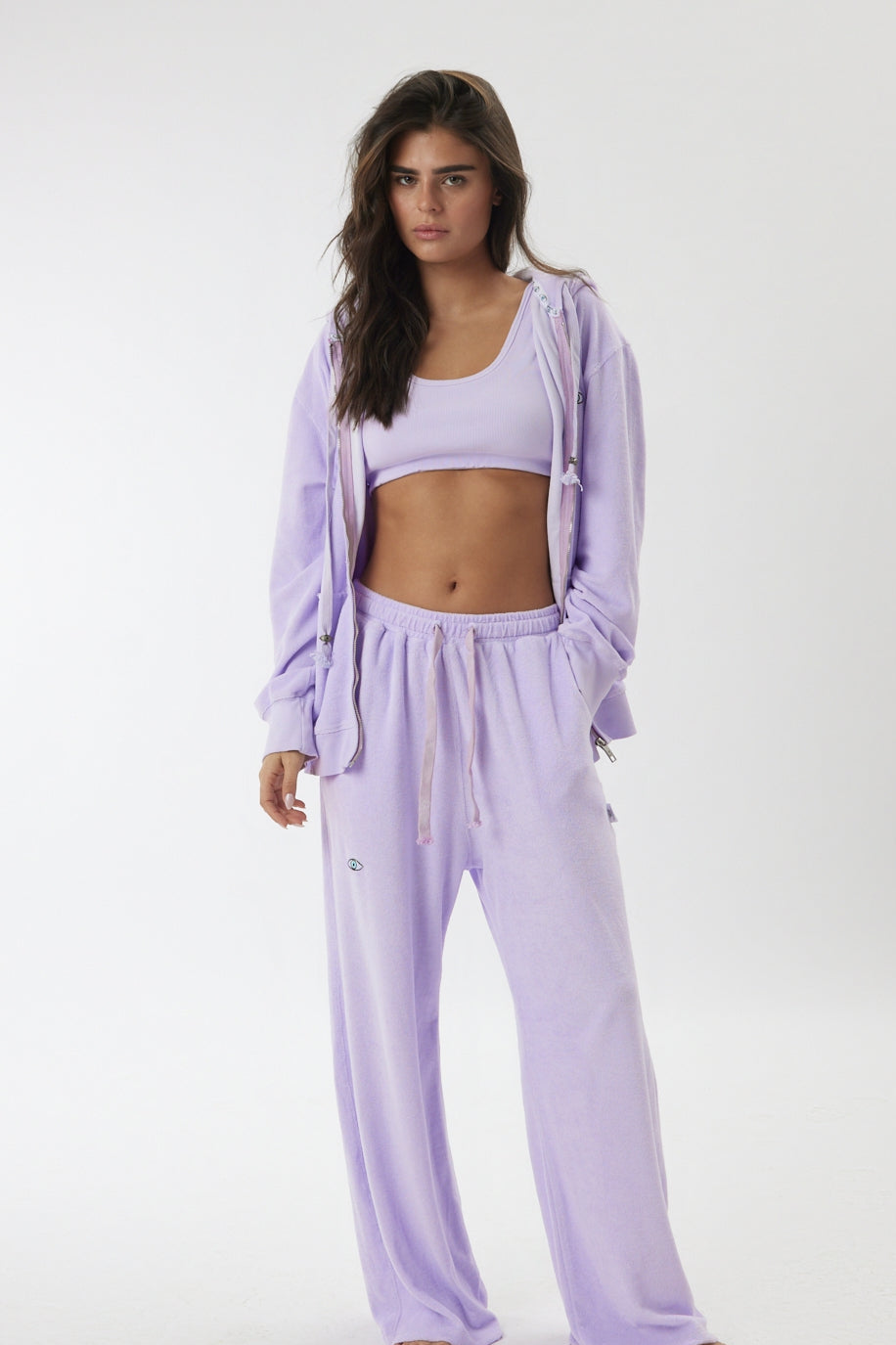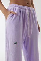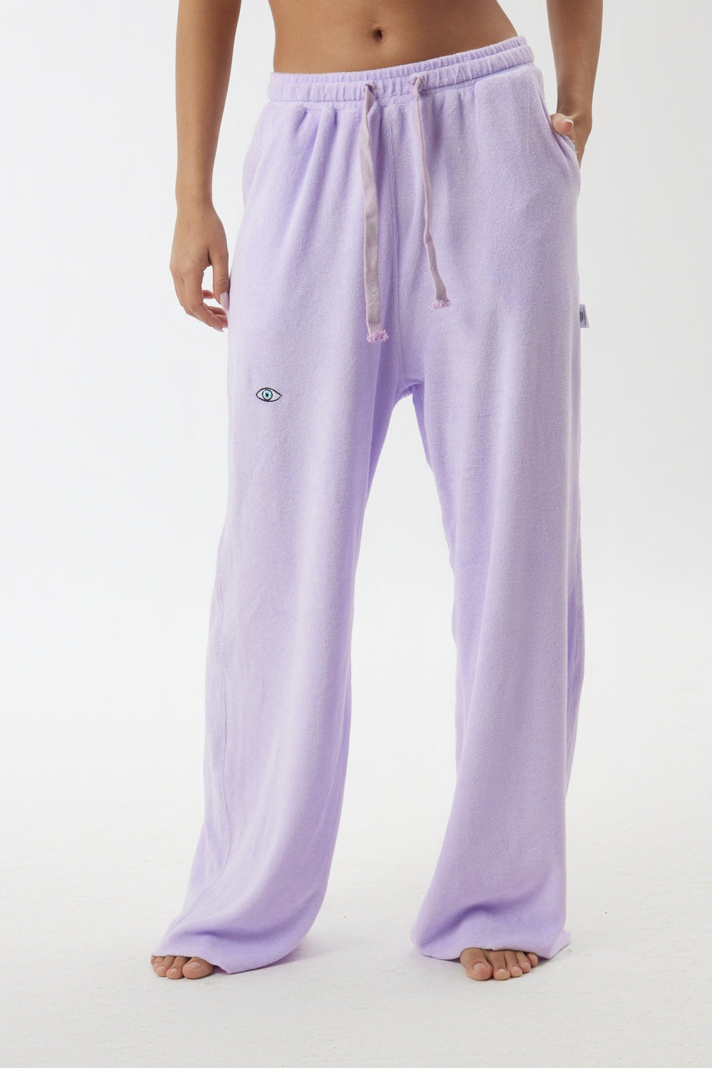 מכנסיים מתרחבים מבד מגבת עשויים 100% כותנה , רקמת עין בחלקו הקדמי של המכנס, גומי במותן, שרוך ממותג מושחל