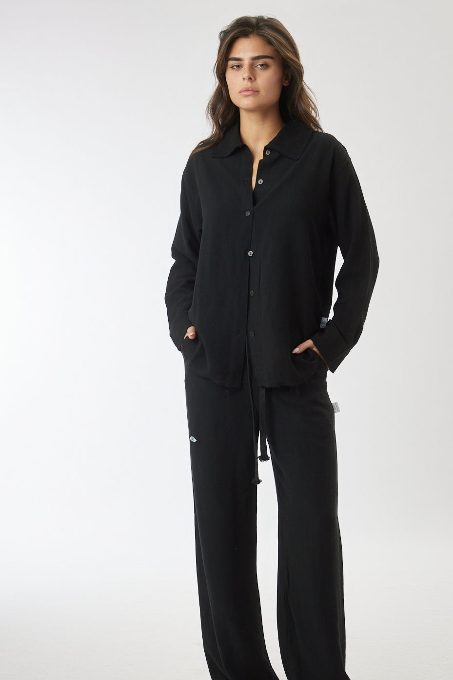 מכנס מתרחב מפשתן רך, רקמת עין בחלקו הקדמי של המכנס, גומי במותן, שרוך ממותג מושחל, כיס חיצוני אחורי עם רקמה