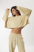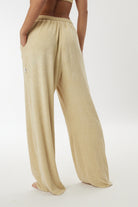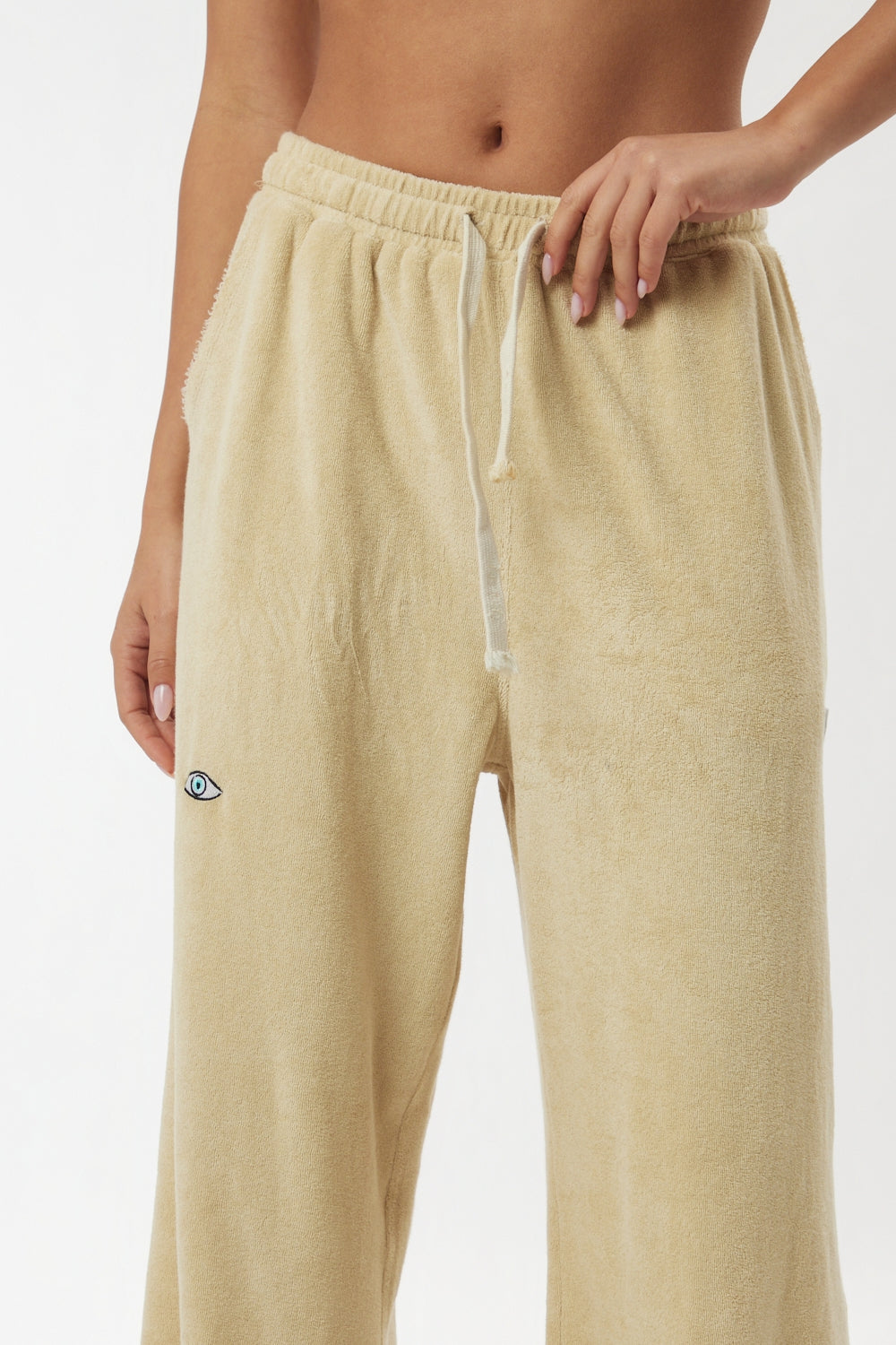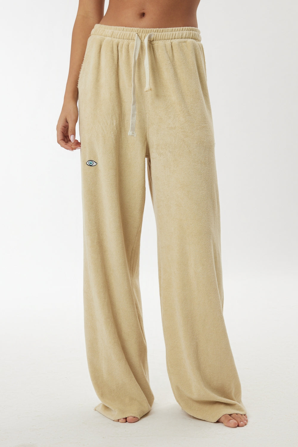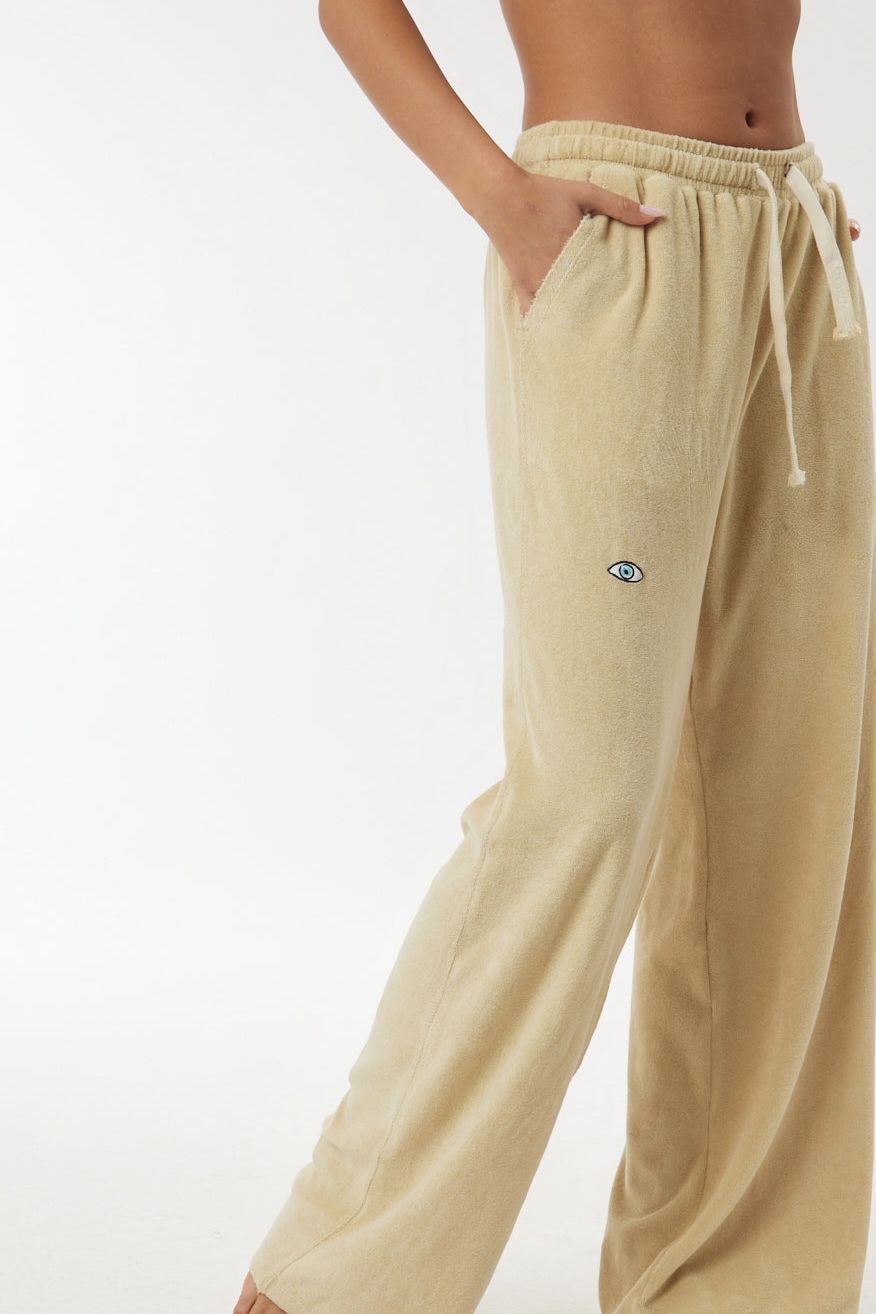 מכנסיים מתרחבים מבד מגבת עשויים 100% כותנה , רקמת עין בחלקו הקדמי של המכנס, גומי במותן, שרוך ממותג מושחל