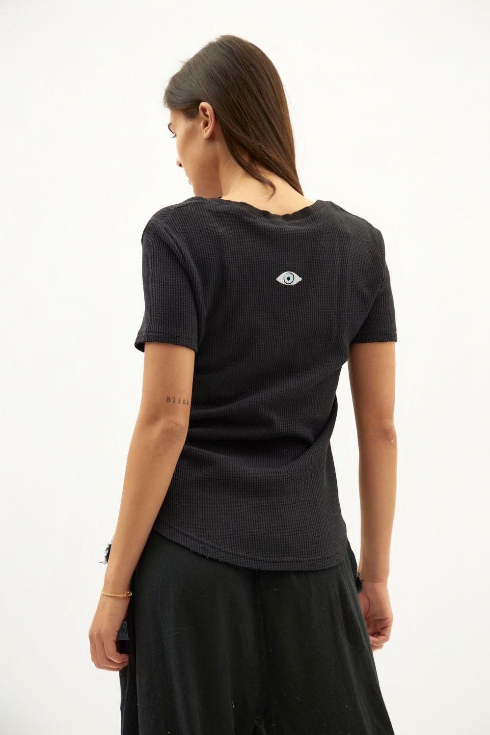 חולצת WAFFLE נשים שרוול קצר במראה UNFINISHED מפתח יו .