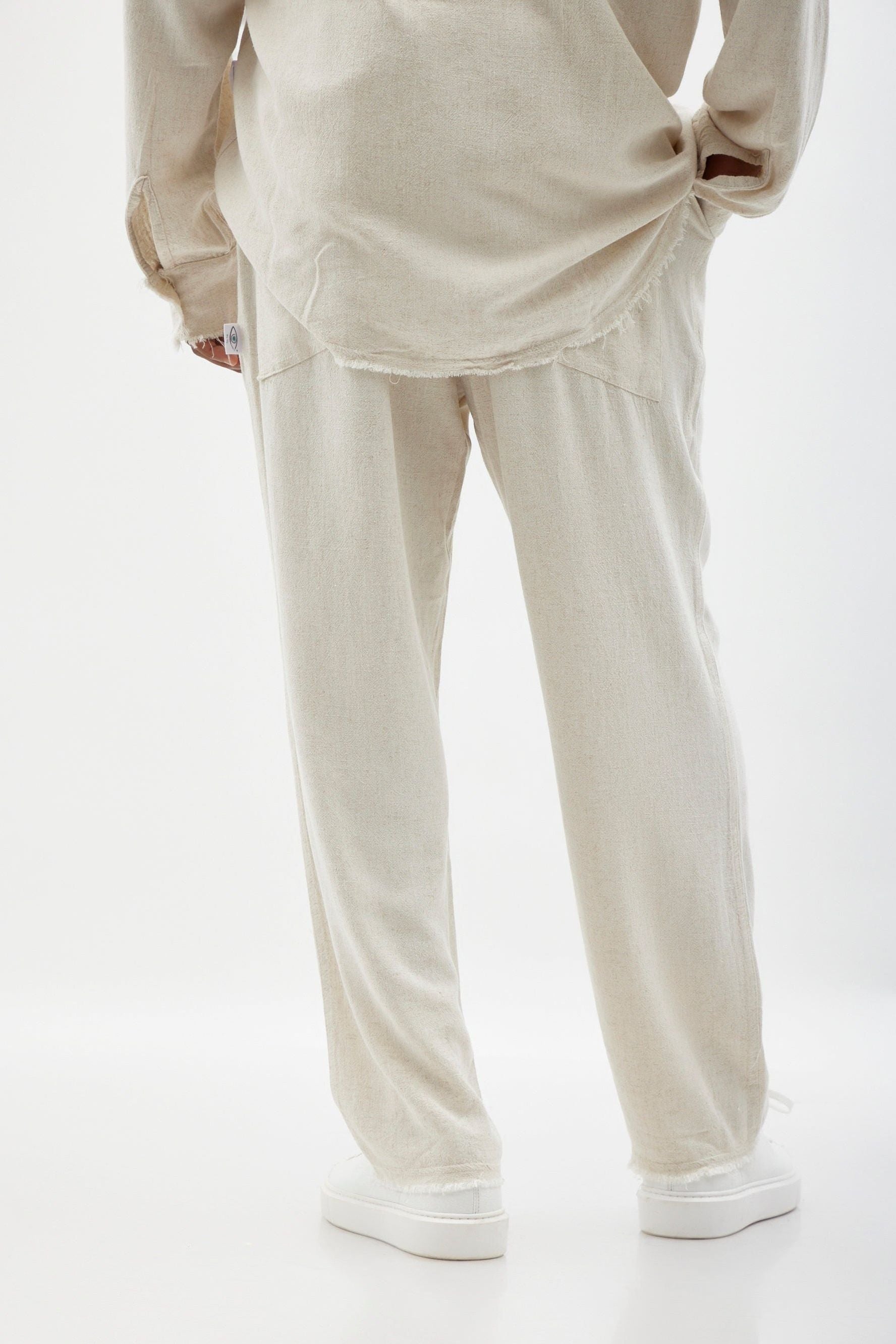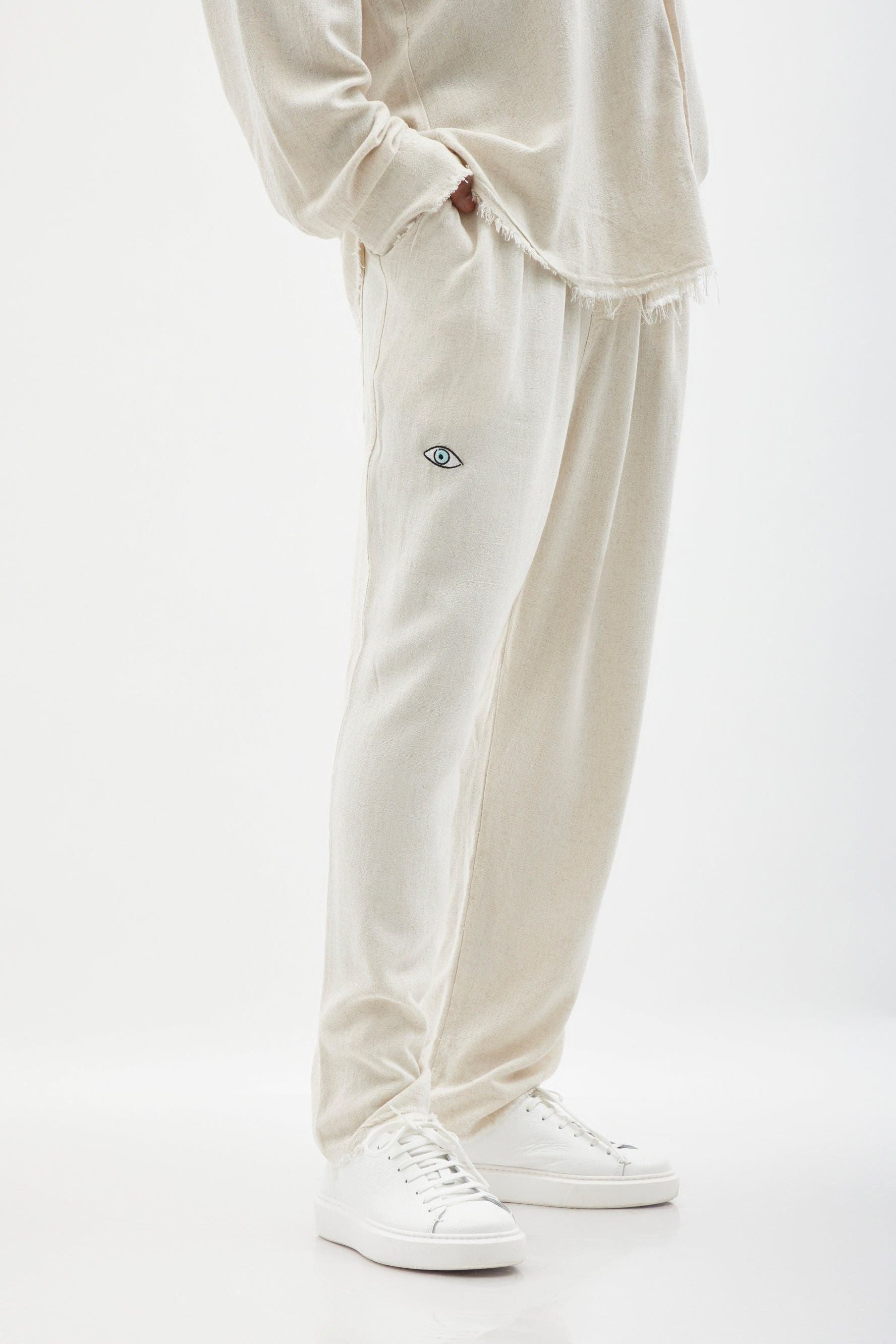 Soft linen pants, eyelet embroidery on the front of the pants, elastic at the waist, branded drawstring, external back pockets and a straight finish at the ankle