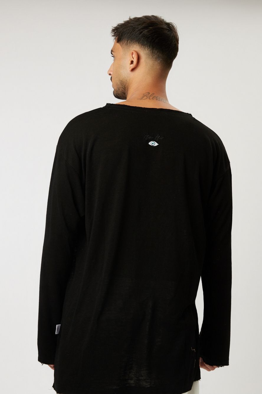 Made from extremely soft fabric, a ripped-look nikki cut combined with an eye print on the back using watercolor and organic pigment.
