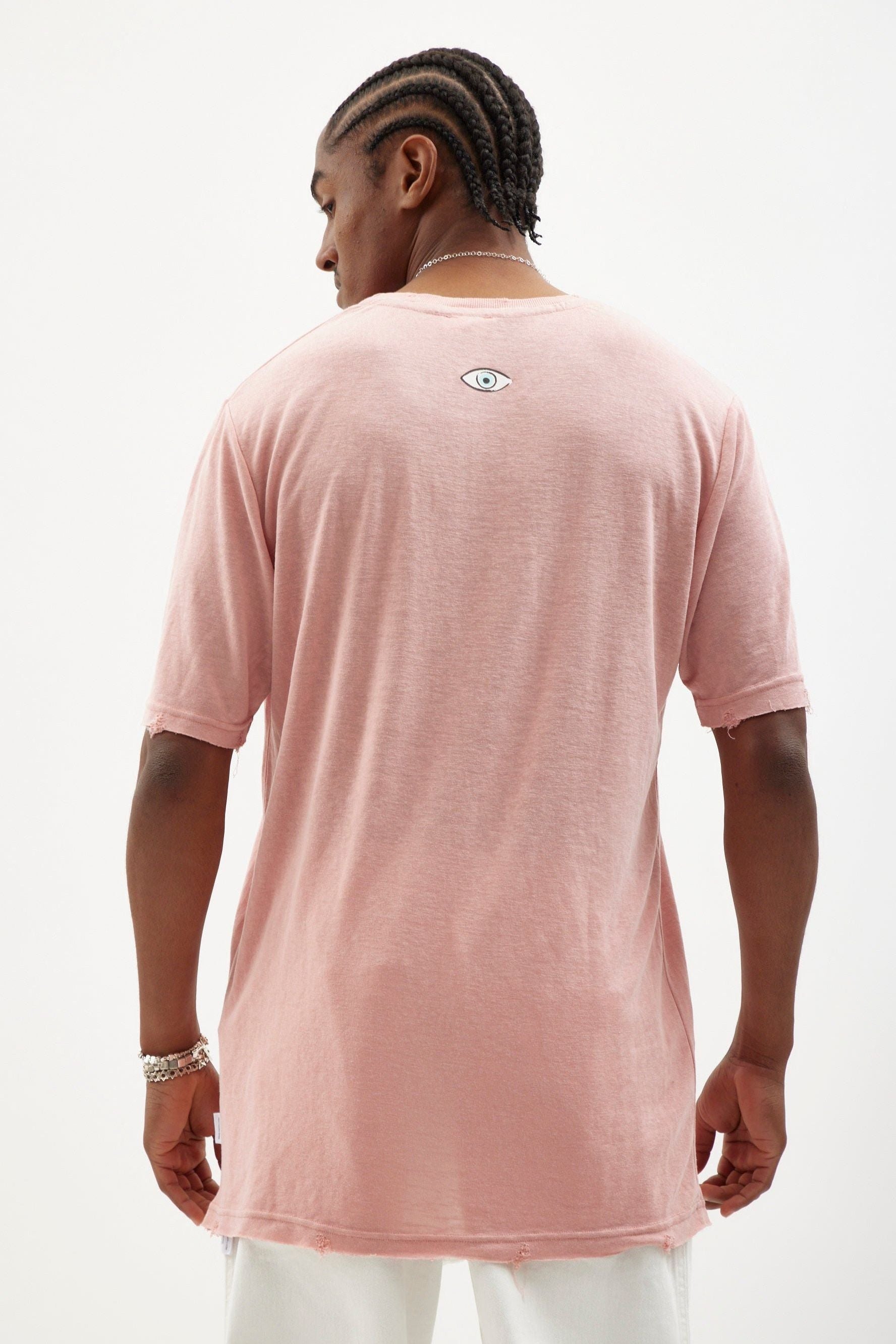 Made from extremely soft fabric, a ripped-look nikki cut combined with an eye print on the back using watercolor and organic pigment.