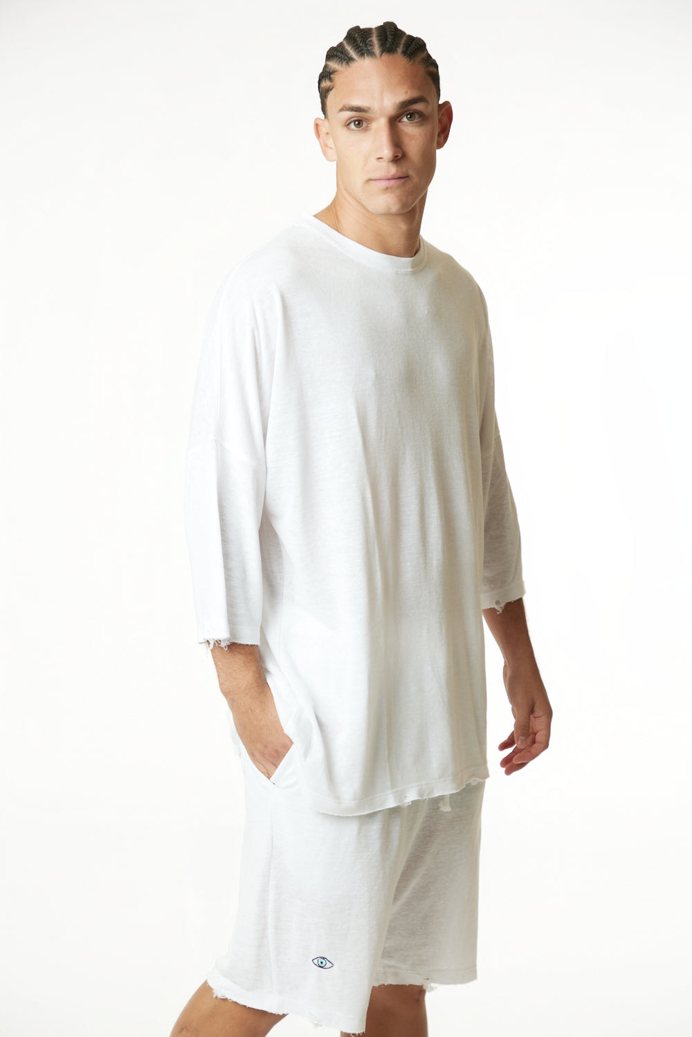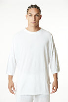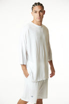חולצת גברים שרוול 3/4 מבד רך במיוחד, עשויה פשתן סרוג, גזרת ניקי במראה לא גמור