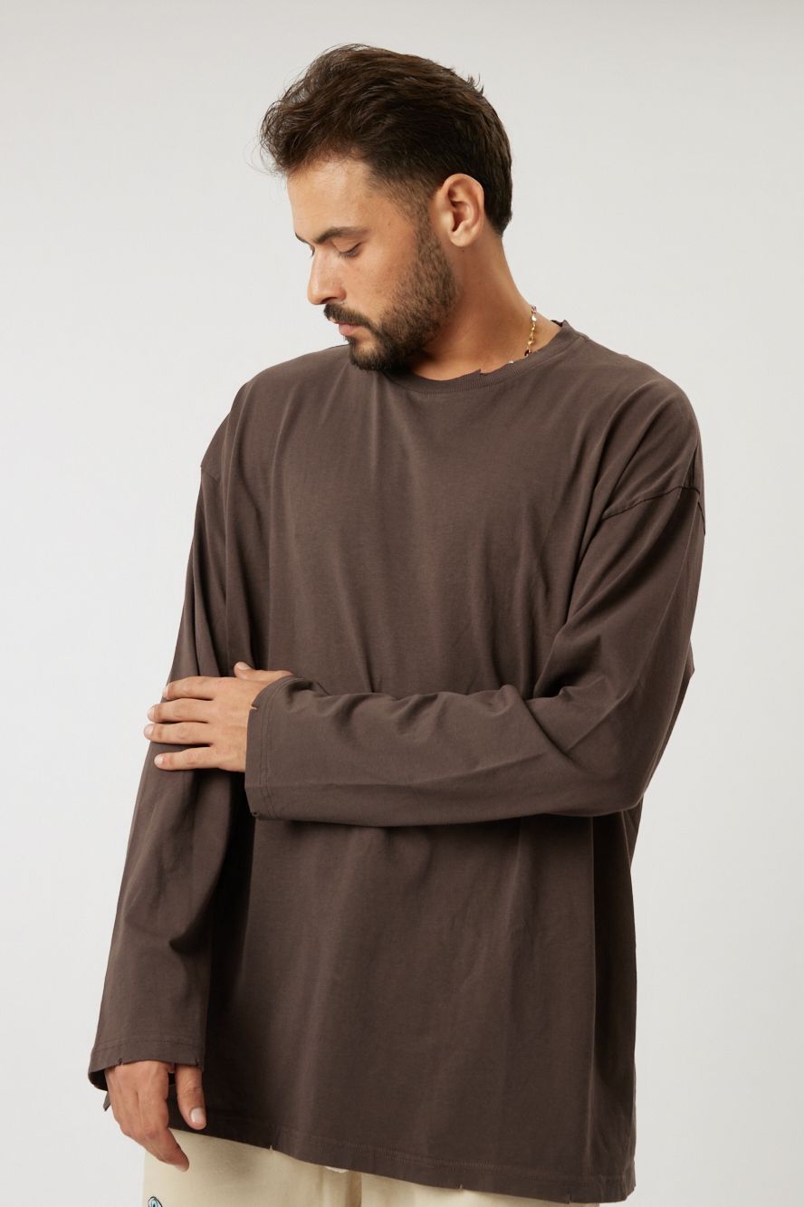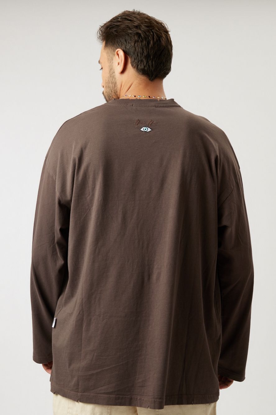 Nikki cut OVERSIZE with a torn look combined with eye embroidery on the back.