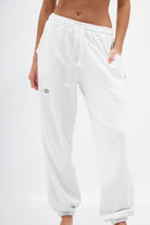 מכנסיים מבד פוטר קל עשויים 100% כותנה , רקמת עין בחלקו הקדמי של המכנס, גומי במותן, שרוך ממותג מושחל