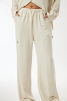 Wide-leg pants made of soft linen, eyelet embroidery on the front of the pants, elastic at the waist, branded drawstring, External back pocket with embroidery