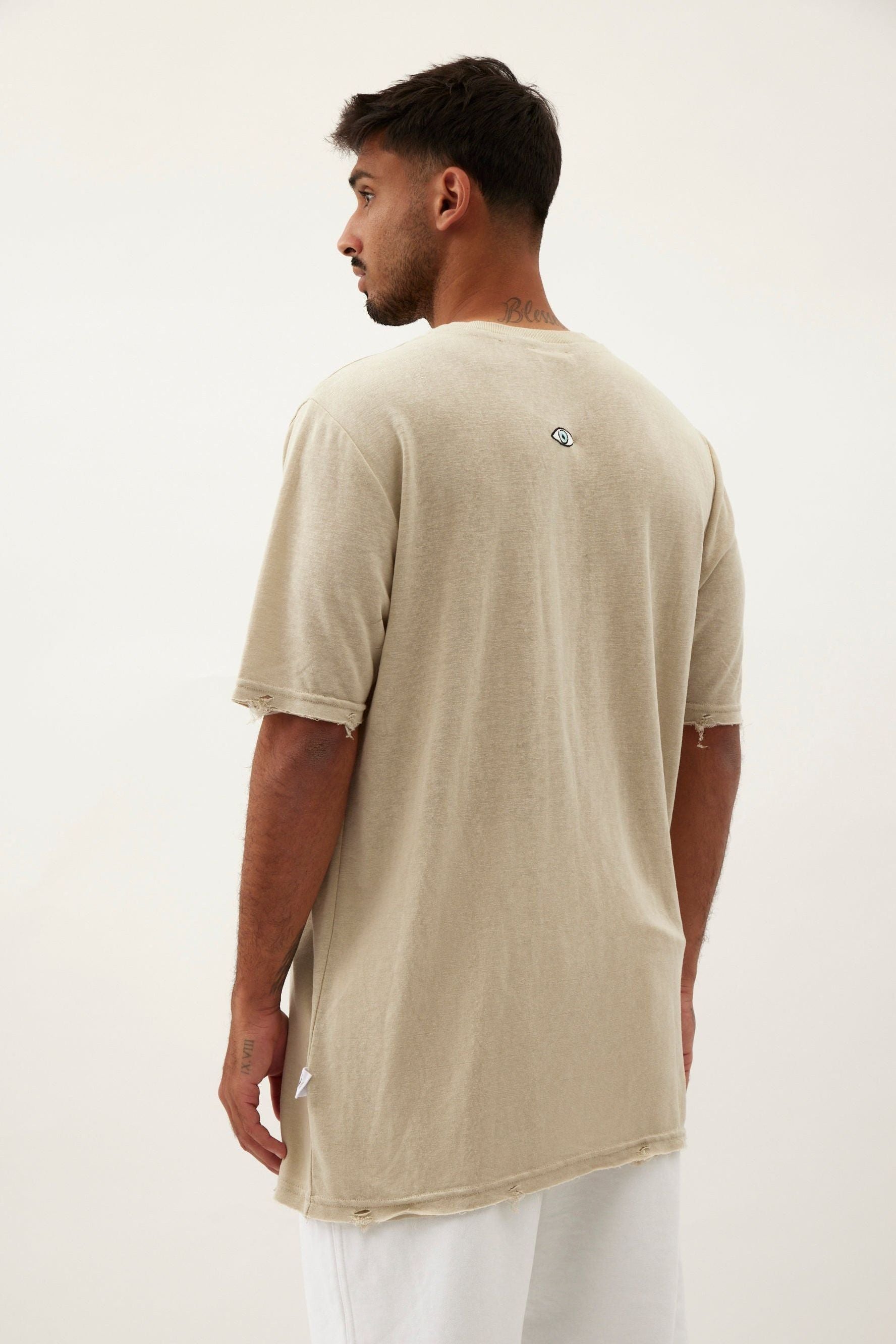 עשויה מבד רך במיוחד, גזרת ניקי במראה קרוע בשילוב הדפס עין בגב בשיטת צבעי מים ופגמנט אורגני.