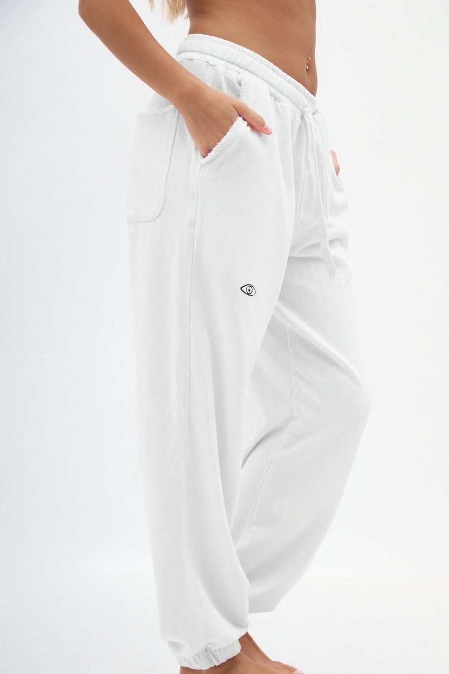 מכנסיים מבד פוטר קל עשויים 100% כותנה , רקמת עין בחלקו הקדמי של המכנס, גומי במותן, שרוך ממותג מושחל