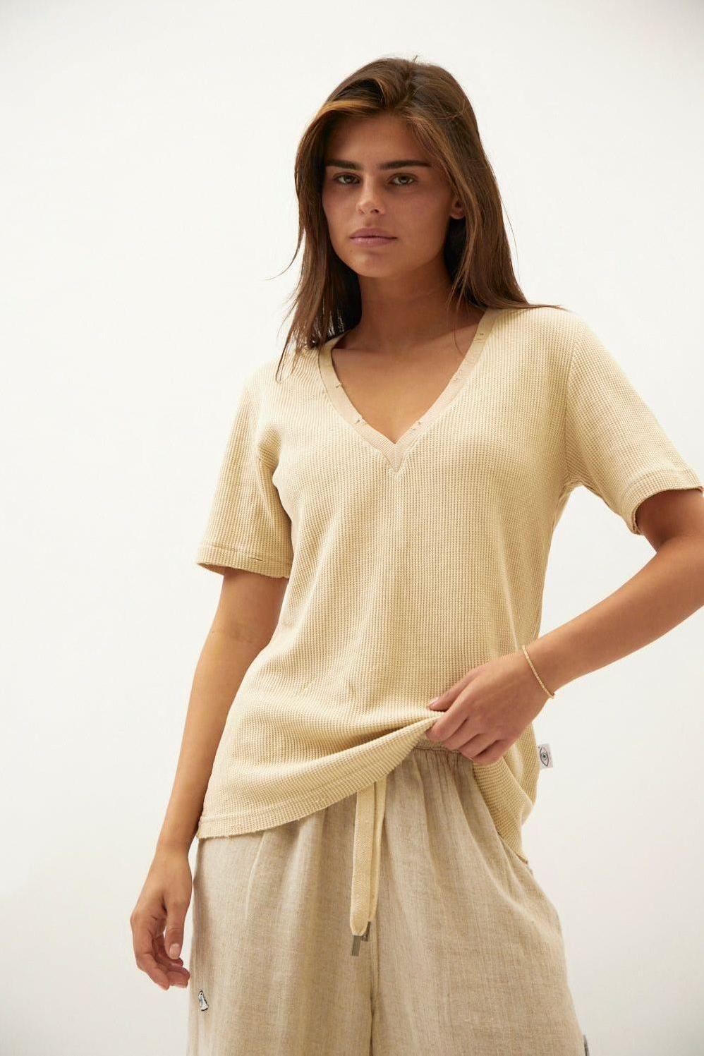 שרוול קצר אבן V WAFFLE חולצת נשים